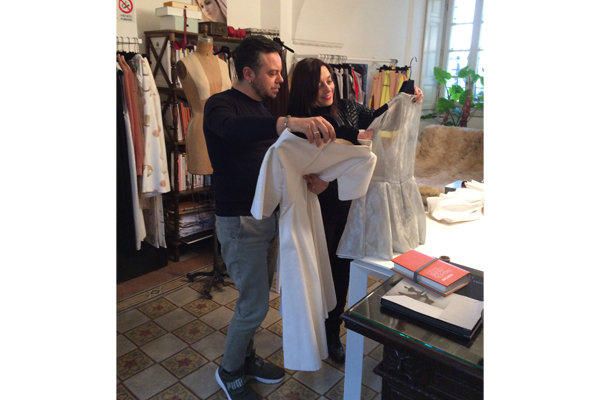 Il terzo step è quando l’idea e la forma incontrano la materia. Ricerco tessuti e materie, vedo come stanno sul manichino, come cadono, come rendono rispetto al mio schizzo e in che modo possono diventare tridimensionali.