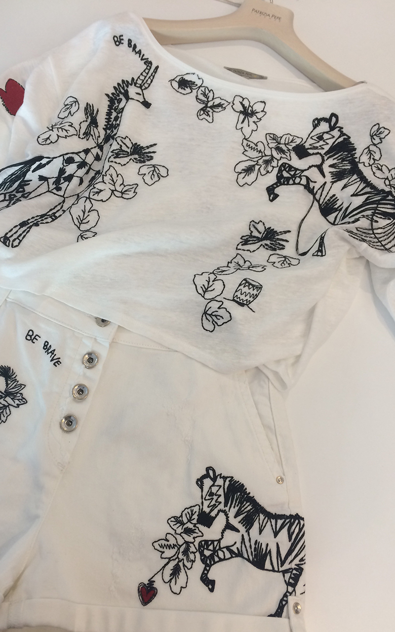 Da Micol Abbigliamento a Castiglione delle Stiviere https://www.facebook.com/Micol-Abbigliamento-1432766010311249/?ref=br_rs, gli elementi che trovo sono un completino spettacolare di Patrizia Pepe, con, pensate un po’, proprio il ricamo nero su fondo bianco di una zebra, impossibile non amarlo!! Per gli amanti degli abiti, un abitino nero, con ricami tono su tono, che si scoprono ad ogni vostro passo, e tanti altri capi per essere sempre eleganti e al top!