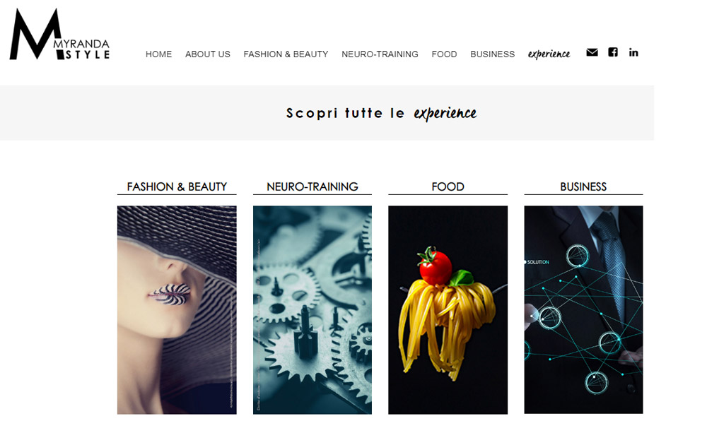 Qui sotto uno screenshot di una pagina del nostro sito Myranda Style dove puoi vedere l'indice del catalogo servizi con la suddivisione nelle 4 macro categorie: Fashion & Beauty, Neuro-Training. Food e Business.